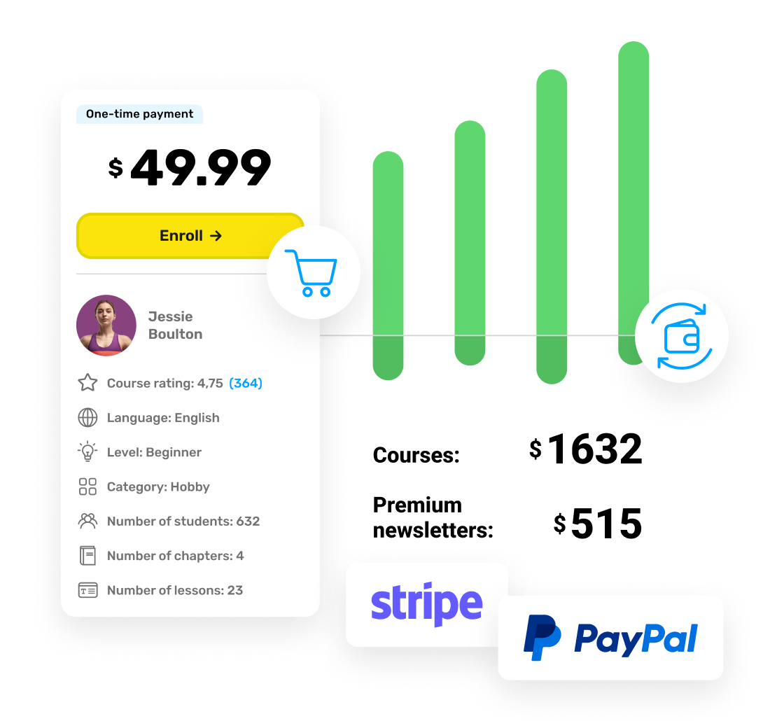 Przeprowadź szybką integrację z głównymi bramkami płatności, aby usprawnić płacenie za Twoje kursy online i subskrypcje.